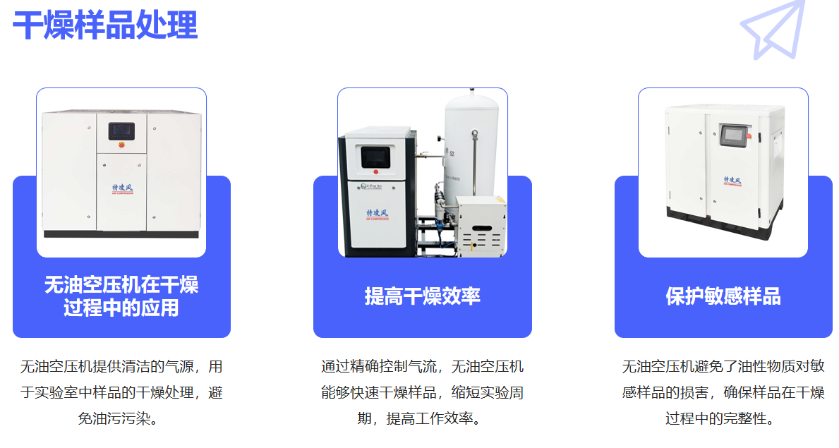 3、样品处理:无油空压机可为实验室提供干燥、无油的压缩空气,用于样品的干燥、分离等处理。